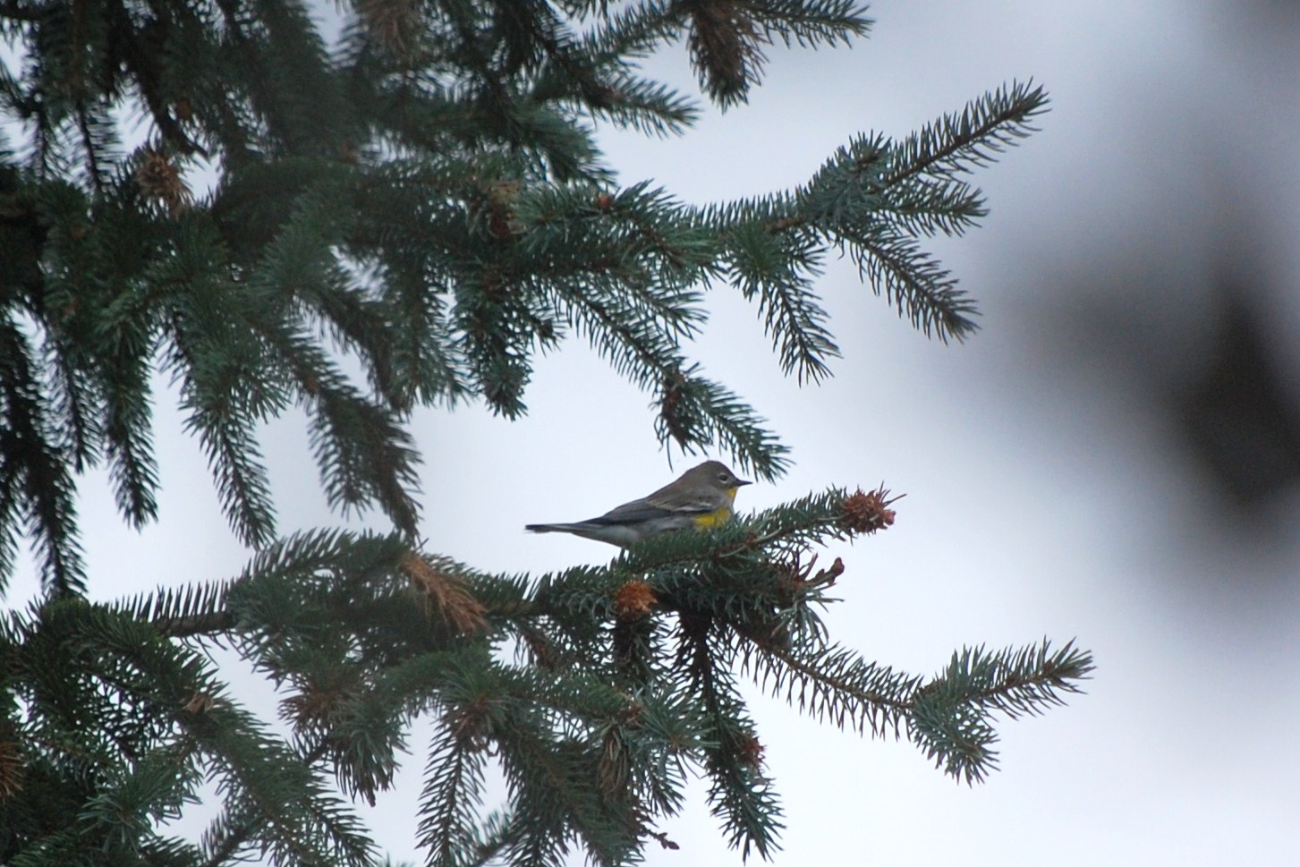 Last Saturday a group of cedar waxwings arrived and left before I could grab photo evidence. Two days ago the chickadees showed up with yellow-patched friends. I got good shots and a woman online suggested it was a yellow-rumped warbler. I never did see his rump, but turns out the yellow patches, streaks and white eye ring are indicative of the western version -- Audubon's warbler.